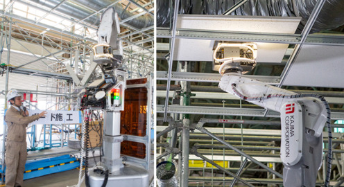 エッジAI搭載、群れで連携して働く「システム天井施工作業ロボット」を公開 テムザックと鹿島建設が共同開発 高所作業を自動化