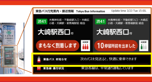 ドコモと東急バス、バスの混雑を避けて乗客の行動を変える「ナッジ」実証実験を発表 バス停の画面にメッセージ配信