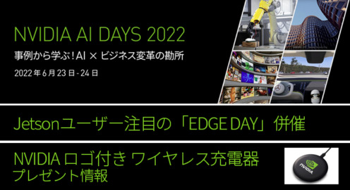 ニュース 「NVIDIA AI DAYS 2022」まもなく開催 Jetson「EDGE DAY」も併催、「NVIDIA ロゴ付きワイヤレス充電器」プレゼント情報 2022.06.21 By ロボスタ編集部