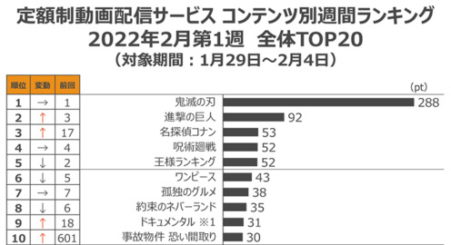 『鬼滅の刃』17週連続首位、2位は『進撃の巨人』 人気のある動画配信コンテンツ GEMランキング ホラー2作品がランクイン