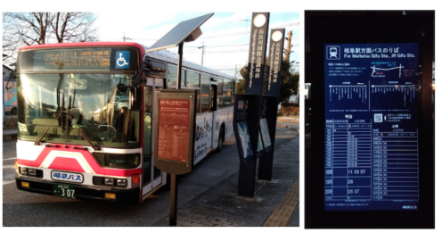 岐阜県「長良川国際会議場前」でスマートバス停の運用開始 ソーラーパネルを搭載し、時刻に合わせ直近の便の時刻を拡大表示