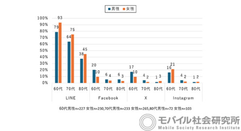 ニュース 【ドコモ調査】シニアのSNS利用率を発表 60歳代のLINE利用は女性が93%、男性が79% LINE・Facebook・X・Instagramの利用率 2024.07.23 By ロボスタ編集部
