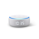 Echo Dot with clock(第3世代)は、第3世代のEcho DotにLEDディスプレイが付いたモデル。ディスプレイには、時間や外気温、タイマーを表示することができる。内蔵の光センサーにより、部屋の明るさにあわせてディスプレイの輝度を自動調整する。Echo Dotの第3世代モデルは、2台用意することでステレオサウンドを構築することができ、このモデルの場合、片方は時計付きモデルではなくてもよい。Alexa対応、対応するスマート家電を音声操作できる。日本では2019年10月16日に発売。