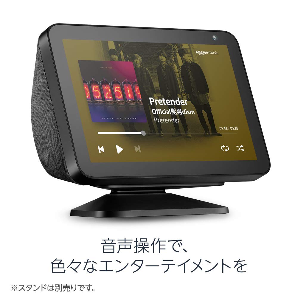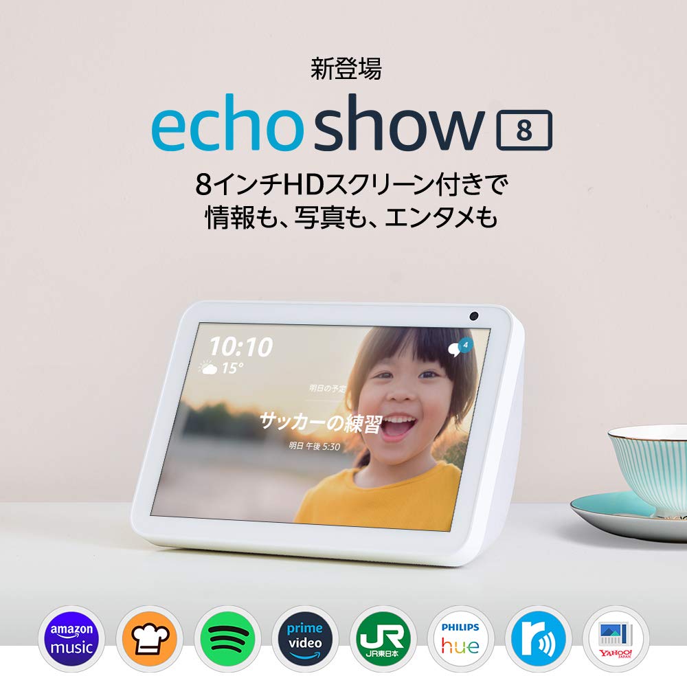 Echo Show 8は、Amazon Echoシリーズの画面ディスプレイ付きスマートスピーカー(スマートディスプレイ)。画面は8インチのタッチスクリーン。高音質ステレオスピーカーを搭載。Echo Showシリーズは情報がスクリーンに表示され、天気予報を画面で確認したり、最新のニュースを映像で確認したりなどが可能。10.1インチのEcho Showと同じ「2.0インチネオジムスピーカーx2(パッシブ低音ラジエーター付き)」を搭載し、高音質な音楽を楽しむことができる。また、Wi-Fi簡単設定にも対応している。その他、CPUやカメラの画素数などの性能はEcho Show 5と同じものが採用されている。10.1インチEcho Showは、Echo Showシリーズで音質、CPU、カメラの性能が最上位モデル。Echo Show5はこれの廉価版。(画像はAmazon.co.jp から引用)