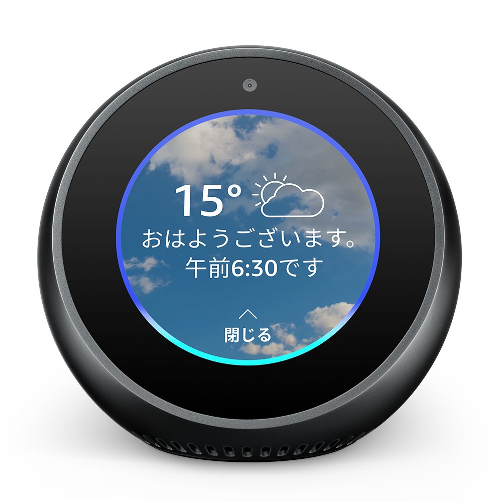 音声アシスタントのAlexaと連携したスマートスピーカー「Echo」シリーズ。珍しく丸型のタッチスクリーン・ディスプレイを搭載している(直径64mm)。他の「Echo」シリーズと同様、音楽や音声アシスタント、各種Alexaスキルを利用でき、ディスプレイ画面上に画像や動画、テキストなどの情報表示ができる。例えば、「Prime Music」で楽曲再生時に歌詞を表示する等できる(一部の楽曲)。 ディスプレイの上部にカメラも搭載しているため、Echo Spotやスマートフォン(Alexaアプリ)を使っている家族や友達とビデオ通話ができる。また、Alexaアプリを使って外出先から部屋の様子を確認することもできる(カメラ位置は固定)。その他、マイクは4つ、外部スピーカー接続用の3.5mmステレオジャック等を搭載している。Bluetooth外部スピーカーとも接続可能。