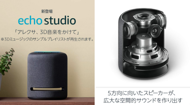 Echo Studioは、3Dミュージックに対応したAmazon Echoシリーズのハイエンドモデルのスマートスピーカー。Amazonのコピーは「スタジオ品質のHi-Fiスマートスピーカー」。5つのスピーカーが、パワフルな低音、ダイナミックな中音、そしてクリアな高音を生み出す。Dolby Atmos技術によりステレオ音源が多次元オーディオ体験に変換され、空間、明瞭性、奥行きを感じることができる。また、デバイスが設置された空間の音響特性を感知し、自動的にチューニングを行う。Alexa対応、対応するスマート家電を音声操作できる。 音楽サービスには、Amazon Music(スタンダード、HD)、Apple Music、Spotify、TuneIn、dヒッツ、うたパスが対応し、Amazon Music HDから3Dミュージックを流すことも可能。