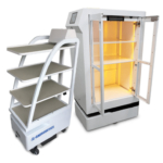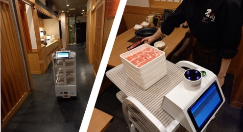 FRUTERAは予め記憶させた施設情報をもとに、厨房から提供するテーブルまでの経路を自ら判断して走行する自律航行運搬ロボット。レールやマーカー等、自律走行のための設備は不要で、テーブルなどのレイアウト変更にも柔軟に対応できるのが特徴。人や障害物を検知した際は音声で注意を促しながら指定されたテーブルまで飲食物等を配膳する機能もある。スマホのアプリ等と連携してQRコードで前後の扉を開けることもできるため、収納スペースで有料商品を販売するといったことも可能。なお、FRUTERAはコンパクトサイズのA-ROBOT-101-Bと、A-ROBOT-101、オプションとして保温冷機能、除菌装置等をラインナップする。(画像1枚目の左が101-B、右が101)
