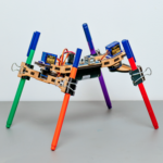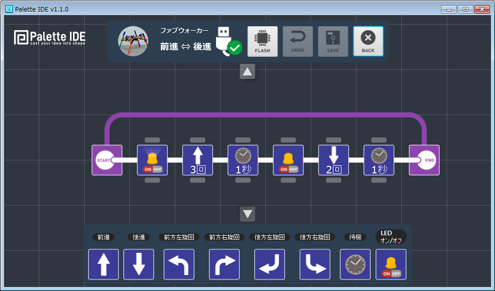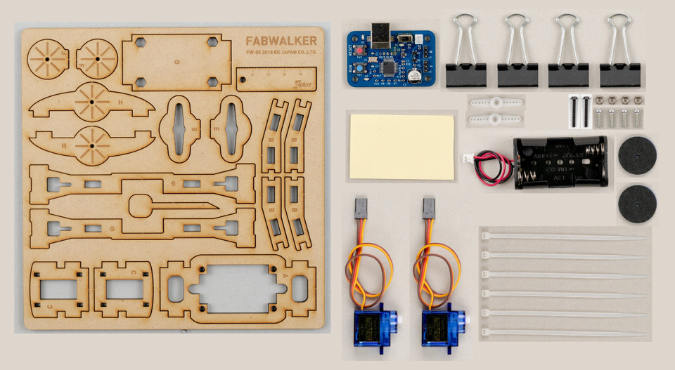 ファブウォーカーは、上手に「歩く」方法を試行錯誤しながら考えるロボットキット。足以外の部品が同梱されており、完成すると4足歩行ロボットになる。4本の足はペンや歯ブラシ、小枝など、身の回りから足になりそうなものを自由に選んで取り付けるようになっている。足に何を取り付けるかによって、ファブウォーカーの歩き方はさまざまに変化し、自分が意図したとおりに歩くよう試行錯誤を重ねることにより、プログラミング的思考を経験することができる。またファブウォーカーの骨格は、レーザーカッターで加工された1枚の板となっており、組み立てを通じて、ねじ止め、接着、結束など、いろいろな工作テクニックが体験できる。完成したら専用ソフトウェア「Palette IDE(パレット・アイディーイー)」から、前後左右、歩き方を自由自在にプログラミングできる。プログラミングはカードを並べるように、カラフルなアイコンを並べるだけの簡単なものとなっている。