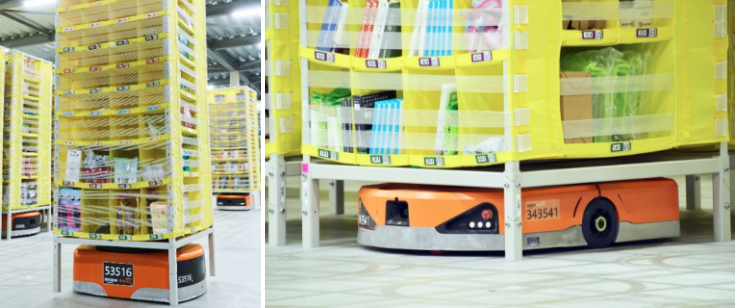 Amazon Robotics Kivaは、Amazonに買収されたKivaSystemsが開発した搬送ロボット。Amazonの物流倉庫で使用されている。作業者が欲しい製品を選択すると、該当の商品が収容された棚ごと作業者の元に運んできてくれる。作業者は巨大な倉庫内を歩き回る必要がない。 暗闇の中でもぶつからないようにプログラムされている。新型モデルは旧式モデルと比べて本体重量が-9kgの軽量化が行われ、積載可能重量は約340kg(旧式)から約567kg(新型)にグレードアップした。なお、移動速度は秒速約1.7mで変更はない。(比較写真は2枚目で、左が旧型、右が新型)日本では、アマゾン茨木FCとアマゾン川崎FCが導入している。
