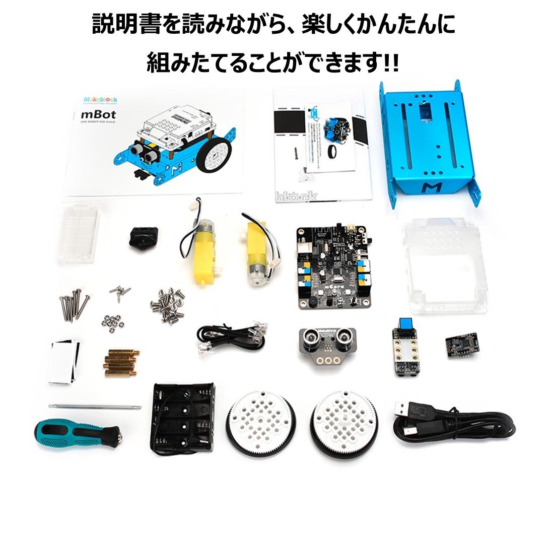 mBotはドライバーを使って組み立てる教育用プログラミングロボット。STEM教育初心者向けの製品。約20種類のパーツを組み立てながら、ロボットの構造やセンサーの仕組みを学ぶことができる。組み立て後は、Scratch(スクラッチ)を基に作られたMakeblock社製のソフトウェア「mBlock」でプログラミングできる。ブロックをドラッグ&ドロップするだけの簡単なUIを採用。センサーには、センサーライントレースセンサー・超音波センサー・光センサーが付属し、黒線の上を走らせたり、障害物を回避したり、好きな色を光らせたりすることが可能。完成後も拡張パーツ(別売り)を購入して装着することで、新しいパターンの動きをプログラミング開発することができる。対象年齢は8歳以上。2021年6月4日にはMakeblockのマイクロコンピュータ「CyberPi」(サイバーパイ)を搭載したmBotの上位版製品「mBot2」が販売開始となった。(画像はAmazonから引用)