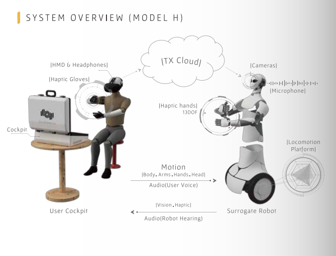 MODEL HはTelexistence社が開発する遠隔操作ロボット。同社はコーポレート・ベンチャー・ファンド「KDDI Open Innovation Fund」を通じてKDDIから出資を受けている。スーツケースのような可搬型ケースがコクピットとなり、ケース内には「制御コンピューター」「赤外線3D位置測定」「VR」ゴーグルや「触覚機器」グローブが収納されている。ゴーグルやグローブを装着して、遠隔地にいるアバターロボット「MODEL H」にアクセス、遠隔操作することができる。 MODEL Hはホイールによる移動機能を持ち、動き回ることができる。アバターロボットが実際に触ったりした感覚を操縦者にフィードバックできる。コピット及びロボットは、有線LAN、Wifi、又は5G/4G/LTEネットワークなど標準的なインターネットを介して接続できる