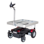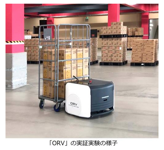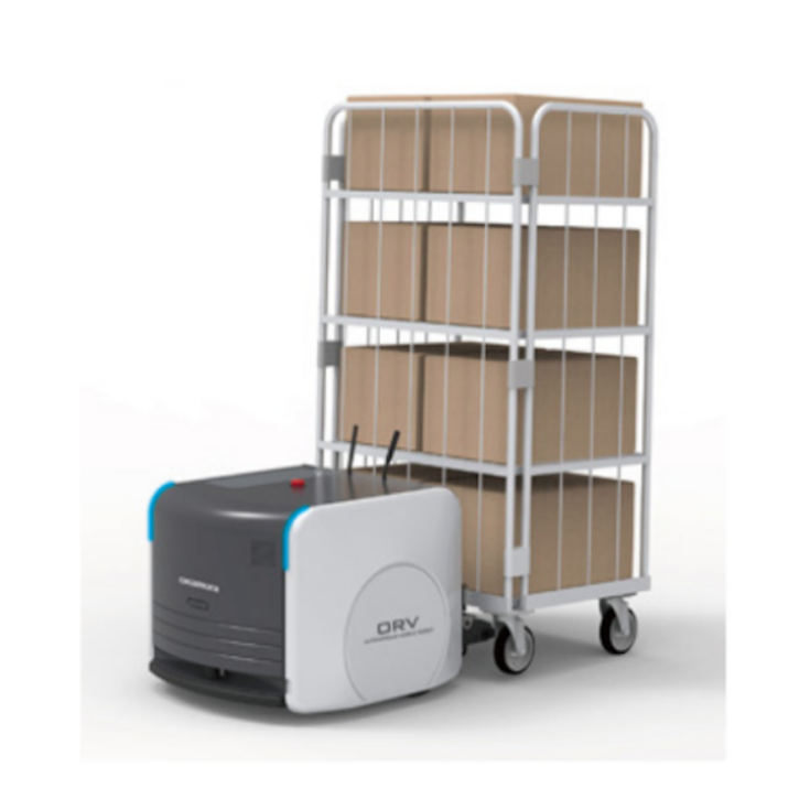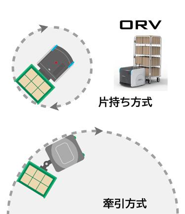 ORV(Okamura Robot Vehicle)はオカムラが開発した自律移動ロボット。人の代わりに荷物が積載された「かご車」を運んで移動する。オカムラとビーイングホールディングスはORVの実用化に向けた実証実験を共同で開始し、2021年6月の実運用を目指すと発表した。ORVは人工知能(AI)によりカゴ車を自動認識して取りに行き、目的地まで障害物を避けながら搬送する。牽引ではなく、カゴ車の片側を掴み上げることで、その場で旋回など小回りが利く動作が可能。ORVが自律移動するためのSLAMと駆動系の制御、そしてかご車を認識するためのディープラーニングによる画像認識といった主要機能はNVIDIA Jetson TX2によって実現している。