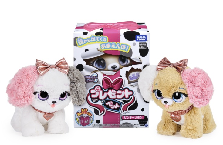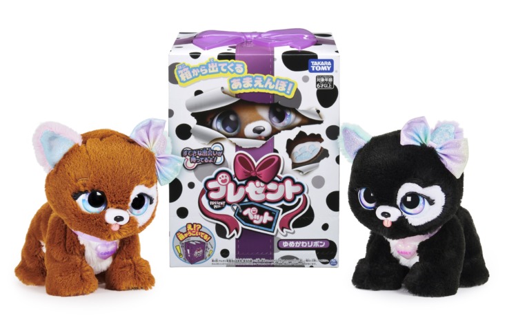 「プレゼントペット」はタカラトミーが2020年10月に発売したペットトイ。ユーザーがプレゼントボックスのタグを引くと、プレゼントボックスがガタガタと揺れながら破れ、仔犬の玩具が中から自ら出てくる。その動画がTwitterで公開され、話題となった。 仔犬がプレゼントボックスから出てきた後は、「お世話」「おしゃべり」「ゲーム」といった3つの遊びが楽しめ、一緒に遊んでコミュニケーションを取ることができる。仔犬のデザインはたれ耳が特徴の「ピンキーリボン」と目元のハート模様が特徴の「ゆめかわリボン」の2種で、それぞれ色違いの2色、合計4種類をラインナップする。どちらの色の仔犬に出会えるかは箱が開いてからのお楽しみ。 同製品は「子どもたちが家族から贈られたギフトボックスを開封すると、新たな家族であるペットが出てくる動画」にインスピレーションを受けて企画されたもの。日本以外にも世界約45の国と地域で同時発売されている(スピンマスター社が発売)。