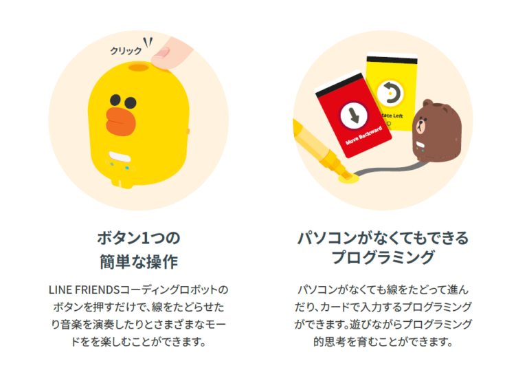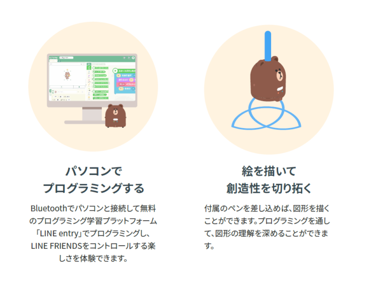 「LINE entry」はLINEみらい財団が提供する無償のプログラミング学習プラットフォームの名称。「LINE entry」と接続してプログラミングして操作したり、オフラインの状態でも付属のコマンドカードなどでプログラムを作って自由に動かすことができるのが「LINE FRIENDSコーディングロボット」。韓国の教育用ロボットメーカーのRobomationと共同開発し、加賀ソルネット株式会社が販売。デザインはLINE FRIENDSキャラクターのブラウン、サリーの2種類。小学生が「プログラミング的思考」を育むことを支援する。