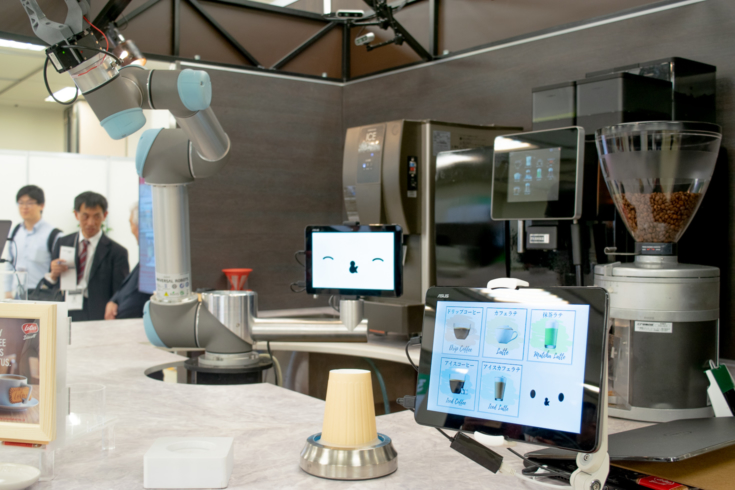 &robot café systemは、UCCホールディングス(上島珈琲)とQBIT Roboticsと共同開発した、コーヒーを淹れてくれるロボット・パッケージで、ロボット/カフェマシン/カウンター筐体があらかじめセットアップされたKIOSKタイプのロボットカフェ。約2.0坪のスペースで、店舗を開店することできる。販売、提供、機材の洗浄などを自動で行ってくれるため、ほぼ無人で運営することが可能。人手が必要なのはシステムの起動・終了と材料の補充と清掃作業のみ。ロボットのベースは、ユニバーサルロボット社の協働ロボット「UR5」を活用している。本来、UR5にはディスプレイがついていないが、おもてなしを大切にするというQBIT Roboticsの考えのもと取り付けられた。国内における独占販売、メンテナンス・サービスなどはラッキーコーヒーマシン株式会社が担当している。(一枚目の画像は公式サイトから引用)