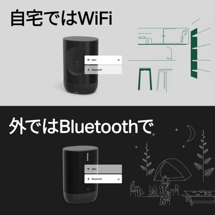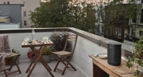 Sonos MoveはSONOSブランド初の充電式スマートスピーカー。1回の充電で最大10時間の連続再生が可能。Amazon AlexaとGoogleアシスタントの両対応機器だが、国内販売開始時点ではAlexaのみ対応。Googleアシスタントは2020年内に対応予定。室内と屋外の使用に対応。室外の使用に耐えるよう外装が強い耐衝撃性ケースで保護されており、湿気、雨、雪、ほこり、塩水噴霧、極度の寒暖に耐える耐候性能「IP56規格」を取得している。Bluetooth接続に対応し、ワイアレススピーカーとして利用できるほか、Wi-Fiと接続できる環境であれば、音声アシスタントを利用したり(ニュースの確認や天気のチェックなど)、ストリーミングサービスを楽しむなどフル機能を使用することができる。Sonos Moveにはあらゆる使用場面でより優れたオーディオ体験をできるよう自動Trueplay機能を搭載。Trueplayチューニングテクノロジーを導入することで、スピーカーが自動的に周辺環境に合わせた最適なバランスに音を調整する。これにより庭のすみずみまでパワフルなサウンドを届けられるという。(画像は公式サイトより引用)