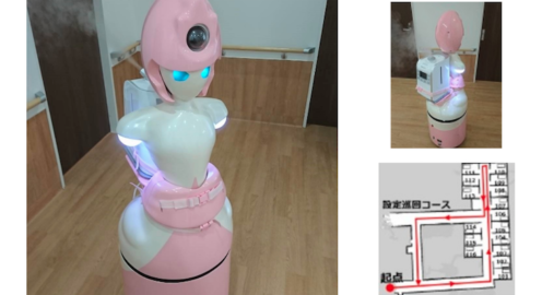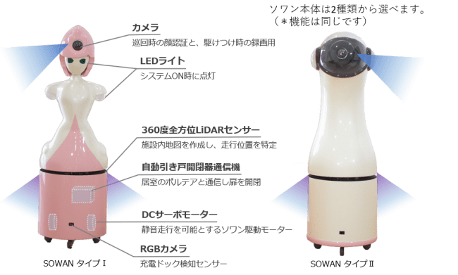 OWANは身長約136cmの自動駆けつけ介護ロボット。「時給88円」のフレーズで話題になった。巡回見守り・異常時の駆けつけ・情報通知等ができる。利用者の腕に装着した活動量計(ウェアラブルデバイス)から送信される脈拍の情報を見守りながら建物内を自動巡回を行う。脈拍数値が設定値を超えるとアラートが鳴る仕組みで、サーバからの出動指示を受けると自動で居室まで駆けつけ、入室と同時に映像の録画を開始する。職員はその映像を遠隔で確認でき、ソワンを通じて利用者と会話することも可能。 巡回は「LiDAR」(360度全方位センサー)と「SLAM」技術により実現しており、定められた時間に、定められた場所から、障害物を回避しながら静かに移動することができる。 自動引き戸開閉装置「ポルテア」を組み合わせて導入することで、緊急時等にソワンが単独で「片引き戸」を開けて入室することができる。 バッテリーは充電約7時間で、約20時間稼働。 「ソワン」とはフランス語で「SOIN=介護」の意。(画像は公式サイトより引用)