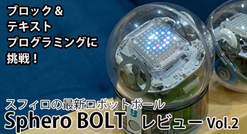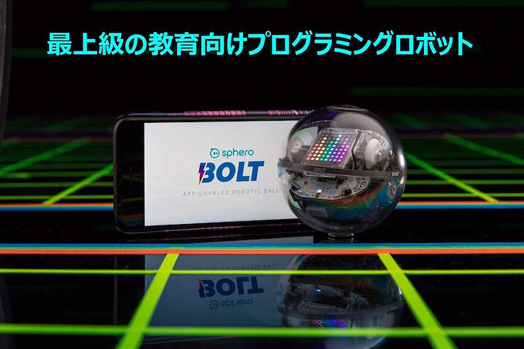 Sphero BOLTはSphero社のアプリ対応のロボットボール。8×8のLEDドットスクリーンを搭載した直径73mmのボール型で、アプリを使ってプログラミングの学習教材としても人気がある。プログラミングは専用の「Sphero Edu」が用意されている。 赤外線通信、デジタルコンパス、光センサー、ジャイロスコープ、加速度計、モーターエンコーダーなど、搭載しているセンサー類をプログラミングで活用することができる。また、LEDで表情を作ってスクリーンに表示したり、赤外線通信で複数のBOLTを連携させて遊んだりすることができる。Sphero Eduには、「ドロー」「ブロック」「テキスト」の3つのプログラミングの方法があり、ユーザーのスキルや習熟度に応じて使用する。様々なアクティビティ(課題)を楽しみながら、様々なレベルのプログラミングを学ぶことで、高いレベルのSTEAM(スティーム)教育を可能とする。