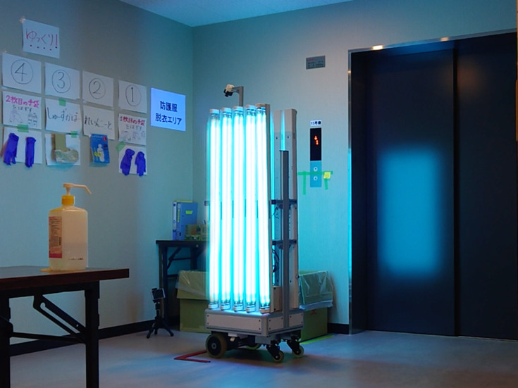 SR-UVCは殺菌効果を持つ殺菌線(紫外線UV-C波⻑254nm)照射ランプを搭載した殺菌ロボット。スマートフォンやPCから専用コントローラーで遠隔操作し、各種ウイルスの不活性化を目指す。Model A、Model B、Model Cの3種類をラインナップし、Model Cは自律走行が可能。照射作業は無人の状態で行う必要があるが、操作用カメラを通して走行時の映像をリアルタイムに確認できる。 「SR-UVC」は新型コロナウイルス感染症の軽症者等の宿泊療養施設、大型ショッピングモール「テラスモール湘南」で実証実験を行ったほか、横浜栄共済病院(神奈川県横浜市)にて導入されている。