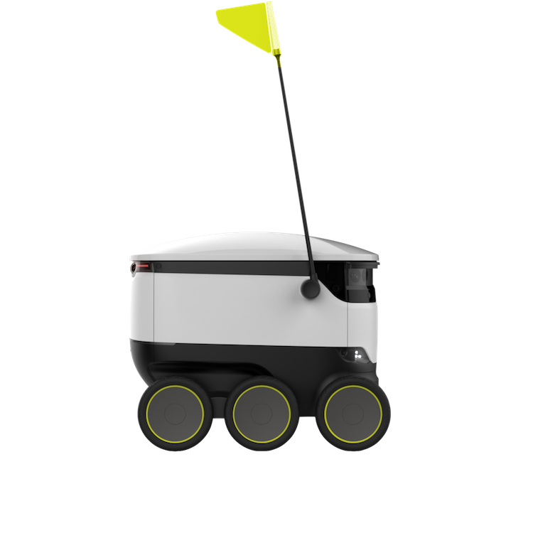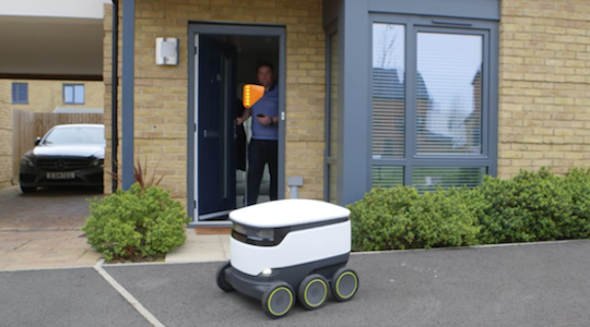 半径3㎞まで物を運ぶことができる自律運搬ロボット(AGV)。利用例としては、アプリからショップに雑貨やスナックなどを注文、受け取り場所を指定すると自動配達してくれるシステムなど。また、商品を入れるスペースにはロックをかけることができ、注文者のみが開けられる機能を搭載、盗難を防止している。2018年11月からイギリス、ロンドンの北西部にある街ミルトン・ケインズでの宅配サービスを開始。およそ半年間で5万回以上の配送を実現している。
